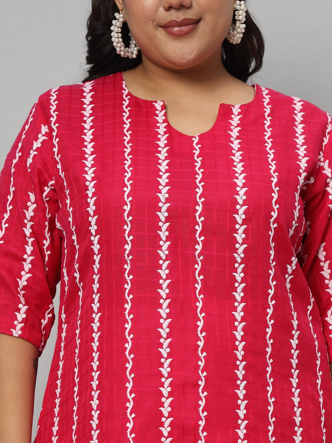 Pink and white cotton embroidered plus size kurta