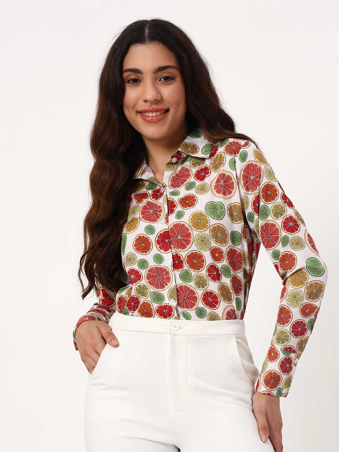 This quirky shirt is sure to catch everyones attention. Crepe fabric assures soft and airy comfort all day long.