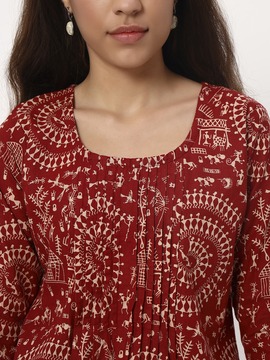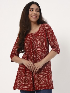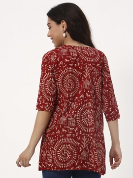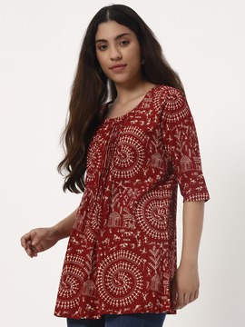 Traditional warli print and brownish red color is here to stay forever. Pair this versatile side cut short kurti with Jeans, Parallel pants, Linen Pants or Shorts
